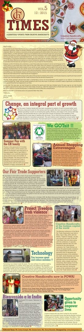 We are happy to have with us many of our buyers throughout the year. This year a few who graced us with their presence were Ms. Ruth Valiant, a garment technician for People Tree, UK who made her usual visit for product development in March 2015. Her knowledge of pattern making and sampling helps our pattern maker to constantly upgrade his skills. Ms. Anne Brady from the Product development team at SERRV visited us in April. Some of the feedback we received was that Creative Handicrafts has grown more in sync with the requirements of SERRV. A designer by profession Anne guides us in the development of the samples for the future collections.